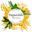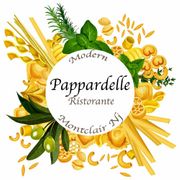 Homemade pappardelle pasta with sautéed chicken, portobello mushrooms, prosciutto, roasted peppers in verde pesto sauce.